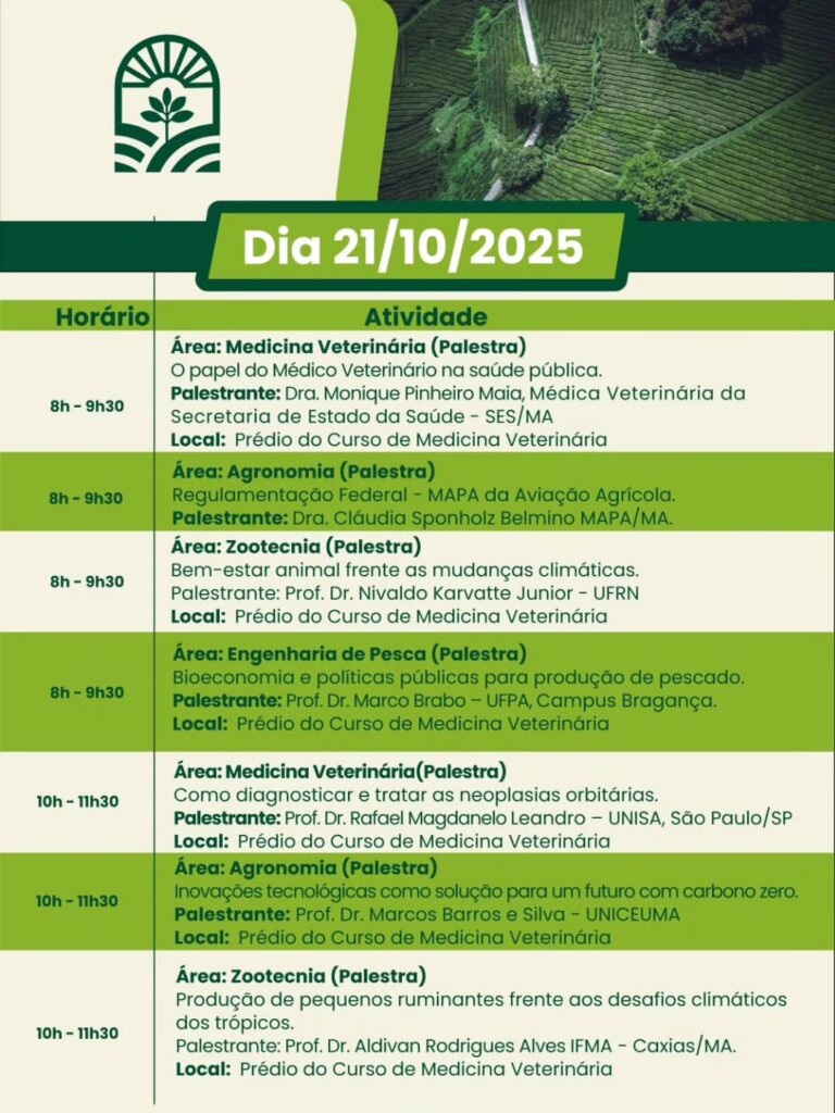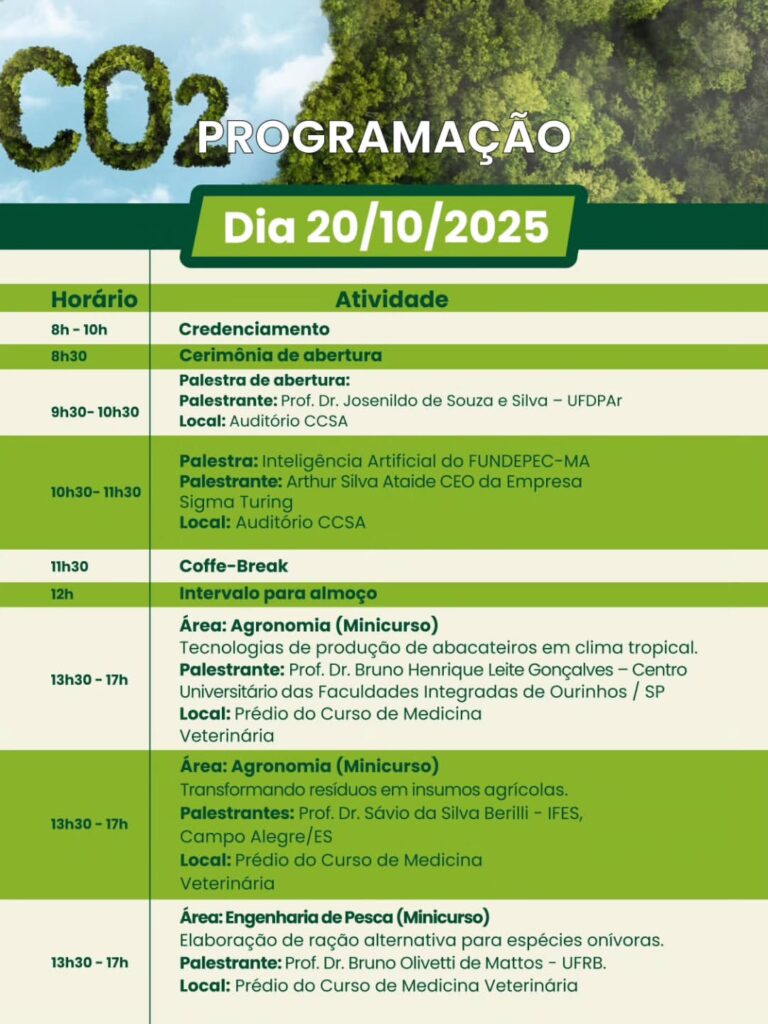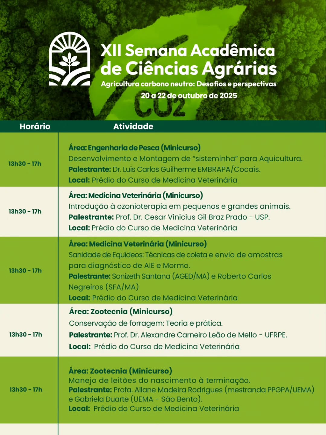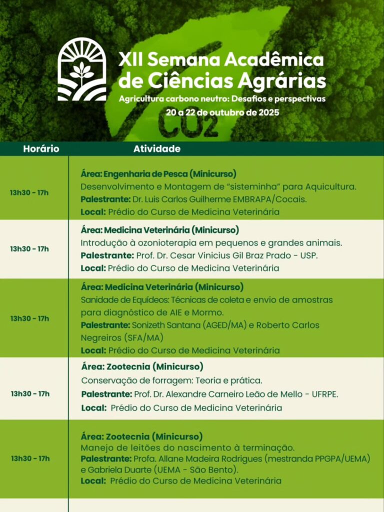 A Universidade Estadual do Maranhão (Uema), por meio do Centro de Ciências Agrárias (Cca), promove a XII Semana Acadêmica das Ciências Agrárias com o tema “Agricultura Carbono Neutro: Desafios e Perspectivas – Reduzindo Emissões e Promovendo Sistemas Produtivos Sustentáveis”.