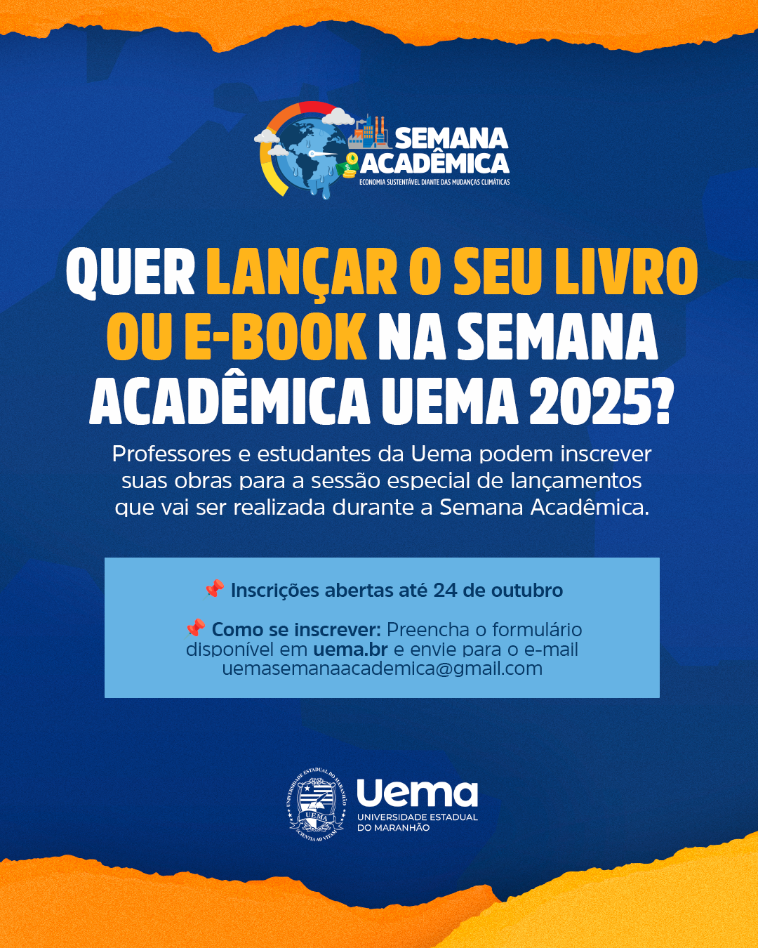 Podem se inscrever autores, coautores ou responsáveis legais por obras publicadas em 2024 ou 2025. Cada participante poderá inscrever até dois livros ou e-books, devendo enviar a Ficha de Inscrição, disponível na chamada interna em anexo, juntamente com a foto do autor e a imagem da capa da obra para o e-mail uemasemanaacademica@gmail.com.