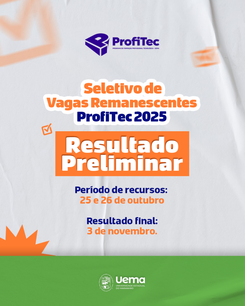 A Universidade Estadual do Maranhão (Uema) divulgou, nesta sexta-feira (24), o resultado preliminar do Processo Seletivo Simplificado de Vagas Remanescentes do Programa de Formação Profissional Tecnológica (ProfiTec) 2025.