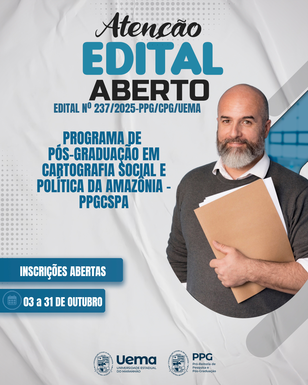 A Universidade Estadual do Maranhão, por meio da Pró-Reitoria de Pesquisa e Pós-Graduação, divulgou o Edital nº 237/2025 para o processo seletivo do Mestrado Acadêmico em Cartografia Social e Política da Amazônia (PPGCSPA).