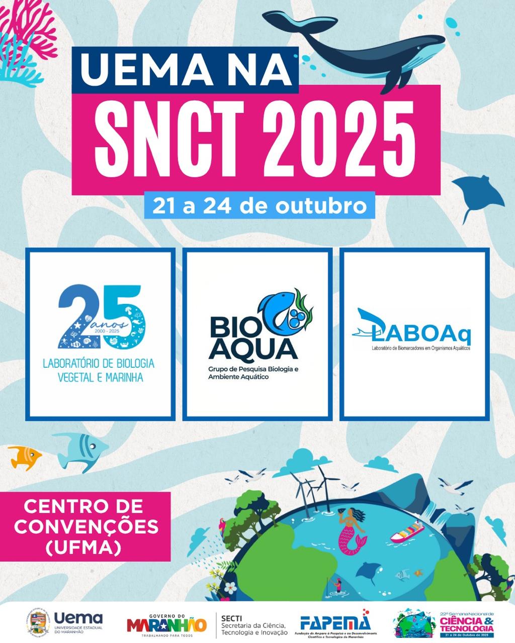 Durante os quatro dias de evento, equipes dos laboratórios de Biologia Vegetal e Marinha (LBVM), de Biologia Aquática (LABIOAQUA) e de Biologia de Organismos Aquáticos (LABOAq) representarão a Uema em estandes e atividades interativas. As ações incluem o minicurso “Mudanças Climáticas em Regiões Costeiras – desafios e oportunidades para a sustentabilidade”, que será realizado no dia 24 de outubro, das 9h40 às 10h40, e a mostra científica “25 Anos de Ciência e Extensão pelo Oceano – Trajetória do LBVM”, programada para o mesmo dia, das 10h20 às 12h.