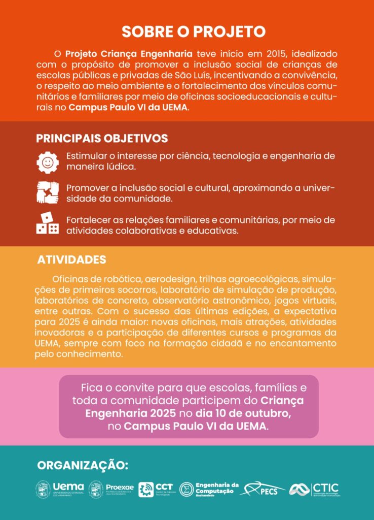 Criado em 2015, o Projeto Criança Engenharia nasceu com a proposta de promover a inclusão social de crianças de escolas públicas e privadas de São Luís, fortalecendo vínculos familiares, comunitários e ambientais por meio de oficinas socioeducacionais e culturais. Ao longo de uma década, o projeto tem se consolidado como espaço de inovação, criatividade e descobertas, aproximando a universidade da comunidade.