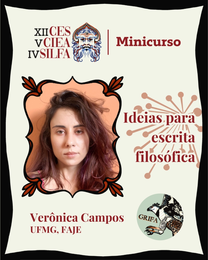 O primeiro, intitulado “Ideias para escrita filosófica”, será ministrado pela Profa. Verônica Campos (UFMG/FAJE) e promovido pelo projeto de extensão GRIFA – Grupo Interinstitucional de Filósofas Analíticas. Com carga horária de 8 horas, o curso abordará aspectos teóricos e práticos da redação de textos filosóficos, desde os diferentes tipos de pesquisa na área até estratégias de composição e estruturação de ensaios acadêmicos. É voltado para estudantes de graduação e pós-graduação em Filosofia e áreas afins, além de professores interessados em qualificar a escrita filosófica em contextos educacionais.