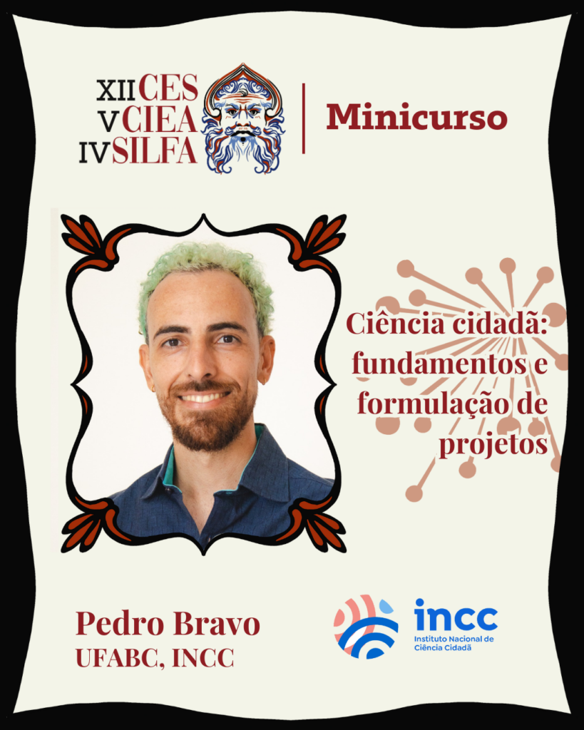 O segundo minicurso, “Ciência cidadã: fundamentos e formulação de projetos”, será conduzido pelo Prof. Pedro Bravo (UFABC), em parceria com o Instituto Nacional de Ciência Cidadã. Com duração de 4 horas, o curso tem como público-alvo professores do ensino médio e propõe introduzir os conceitos centrais da ciência cidadã, bem como apoiar a elaboração de projetos escolares nessa perspectiva. A proposta é oferecer uma base teórica e prática para que educadores possam desenvolver iniciativas que envolvam os estudantes em atividades científicas participativas, com exemplos nacionais e internacionais.