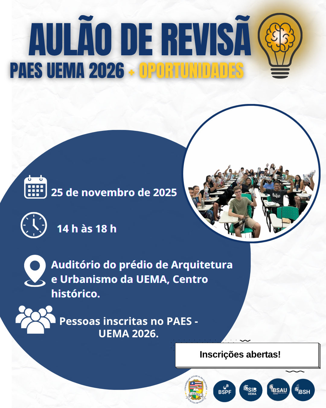 A Universidade Estadual do Maranhão (Uema), por meio das Bibliotecas Setoriais de História, Arquitetura e Urbanismo e Uemanet, divulga a terceira edição do Aulão de Revisão de História para o Processo Seletivo de Acesso à Educação Superior (PAES). A atividade será realizada no dia 25 de novembro (25), às 14h, no prédio de Arquitetura e Urbanismo, localizado na Rua da Estrela, nº 472, no Centro Histórico de São Luís.