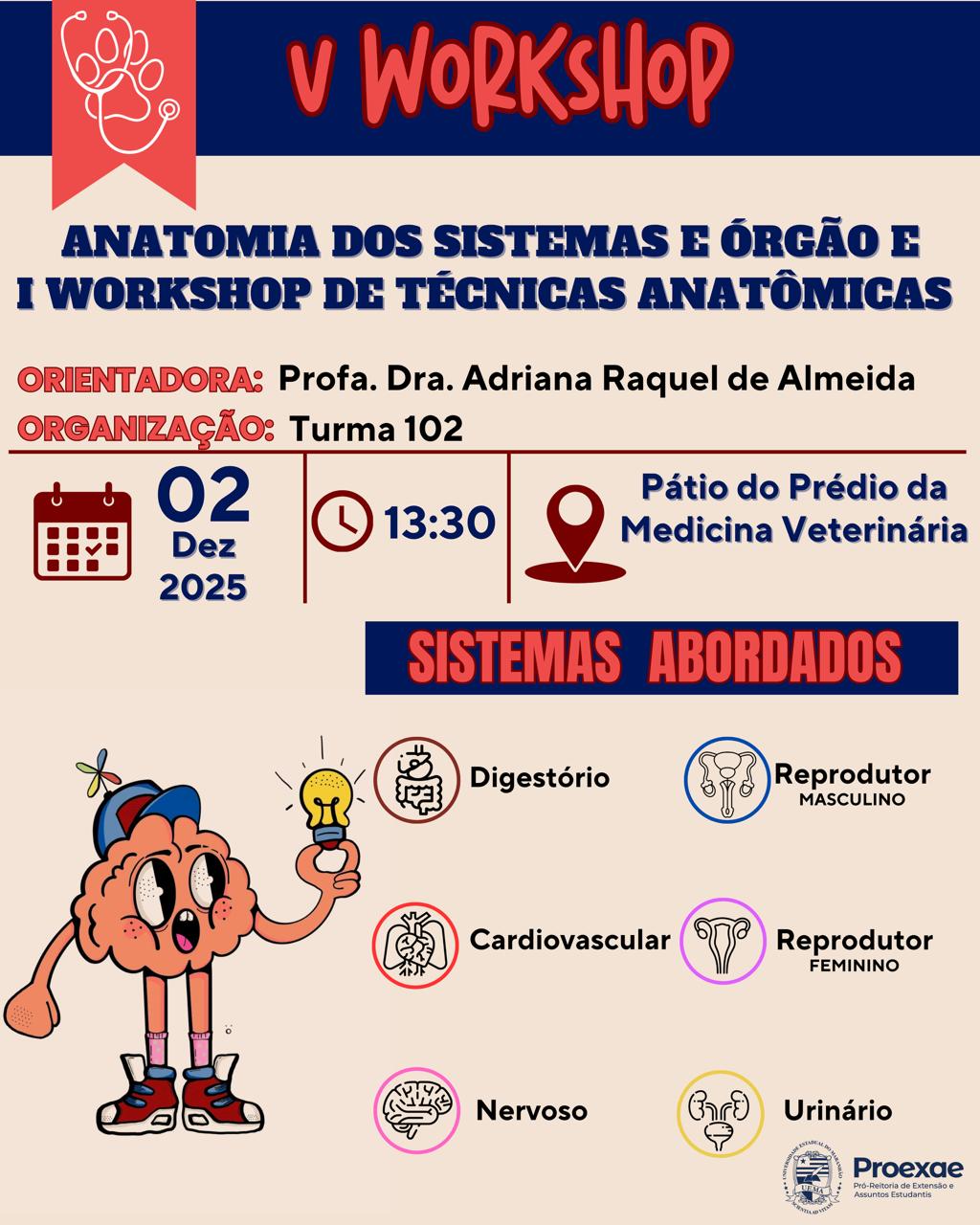 A turma do segundo período do curso de Medicina Veterinária da Universidade Estadual do Maranhão (Uema) promoverá, no dia 2 de dezembro de 2025, o V Workshop de Anatomia dos Sistemas e Órgãos e o I Workshop de Técnicas Anatômicas, eventos que se consolidam como importantes espaços de formação e divulgação científica dentro da instituição.