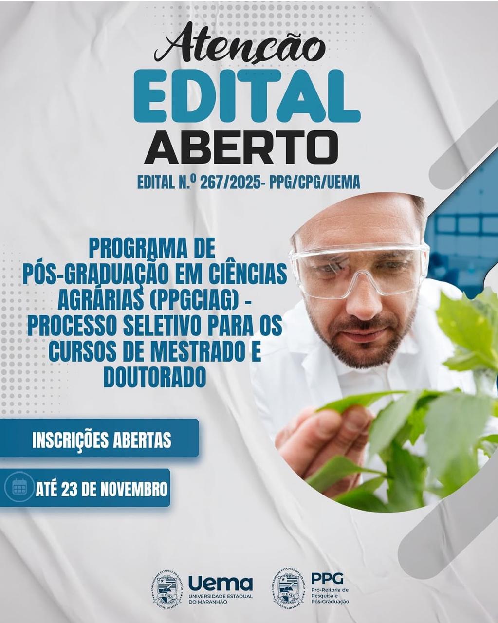 A Universidade Estadual do Maranhão (Uema), por meio da Pró-Reitoria de Pesquisa e Pós-Graduação (PPG), está com inscrições abertas até o dia 23 de novembro para o Programa de Pós-Graduação em Ciências Agrárias (PPGCIAG), que oferece 16 vagas para o Mestrado e 17 para o Doutorado.