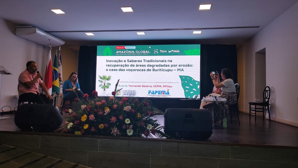 A Universidade Estadual do Maranhão (Uema) participou da programação da Universidade Estadual do Pará na COP 30, em Belém, por meio do professor José Fernando Rodrigues Bezerra, do Departamento de Geografia da Uema e professor do Mestrado e Doutorado Acadêmicos em Geografia, Natureza e Dinâmica do Espaço (PPGEO), que apresentou um estudo sobre processos erosivos e recuperação de áreas degradadas no município de Buriticupu, no Maranhão.