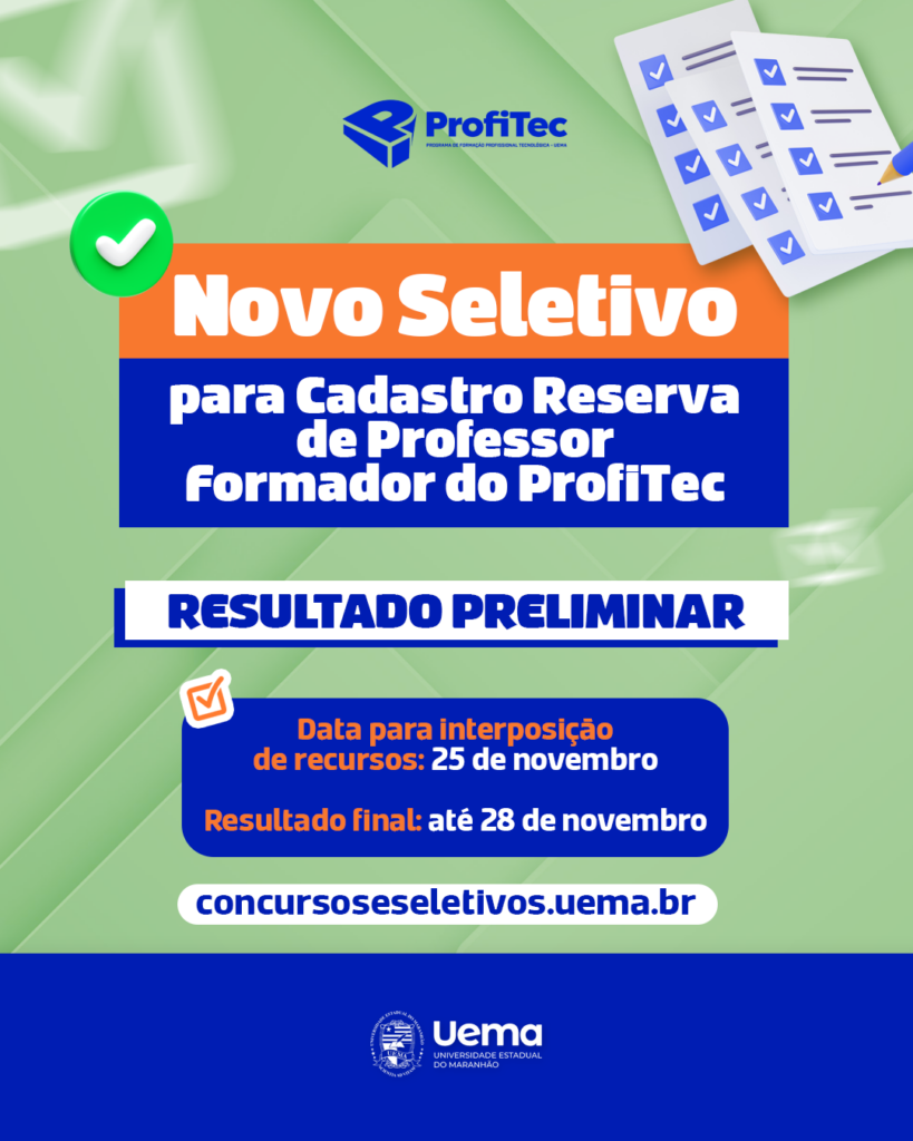 A Universidade Estadual do Maranhão (Uema) divulgou, nessa segunda-feira (24), o resultado preliminar do novo Processo Seletivo Simplificado para formação de cadastro reserva de professores formadores do Programa de Formação Profissional Tecnológica (ProfiTec).