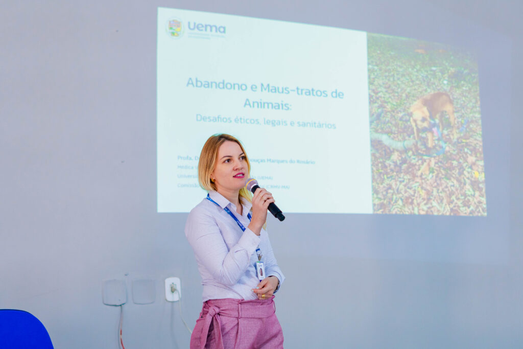 A programação teve início com a professora Carla Janaina Rosário, docente da Uema e presidente da Comissão de Medicina Veterinária Legal do CRMV-MA, que ministrou a palestra “Abandono e maus-tratos de animais: implicações éticas, legais e sanitárias”. Em seguida, o médico-veterinário Diego Marques Costa Silva, doutorando em Ciência Animal pelo HVU-Uema, falou sobre “Leishmaniose canina: perspectivas éticas e legais”. A médica-veterinária Juliana Sá Vitor, mestranda em Ciência Animal e integrante do LAMIV-Uema, palestrou sobre a temática “Esporotricose felina: desafios sanitários e sociais”.