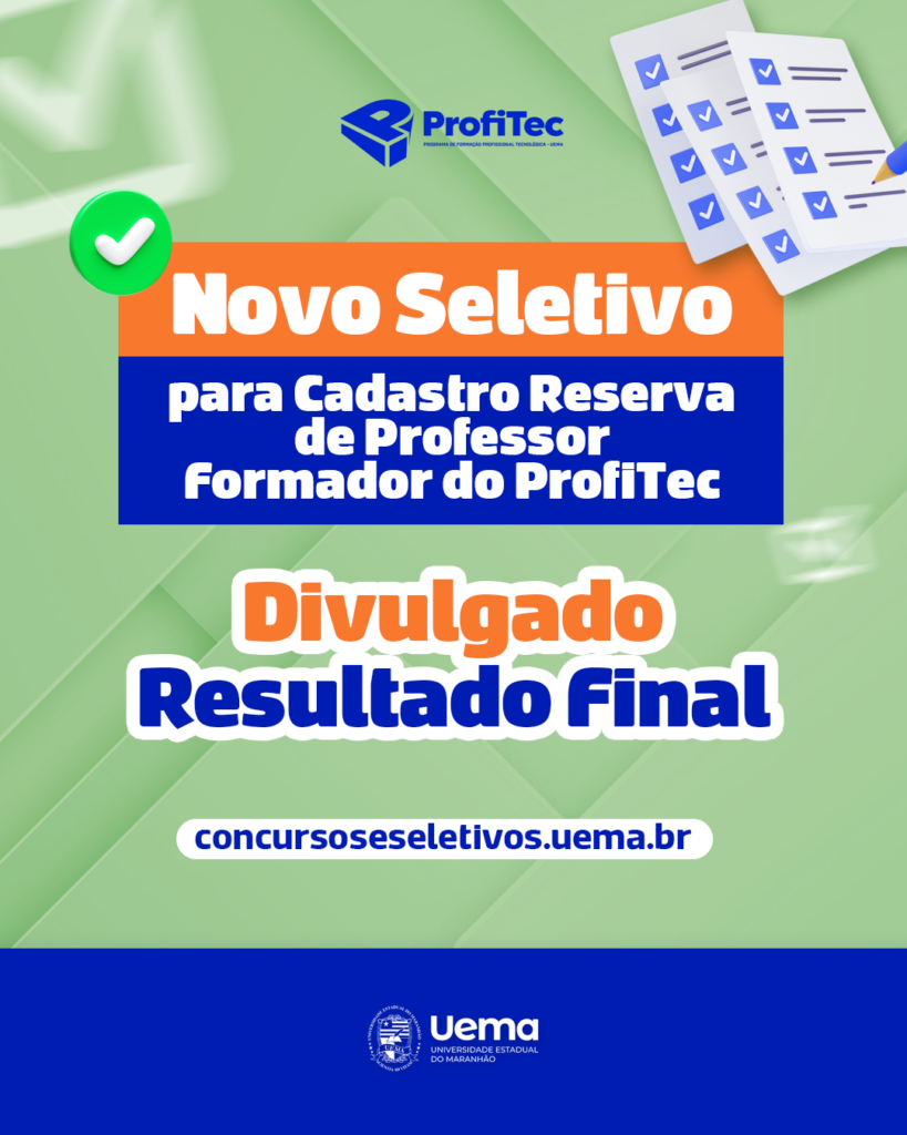 A Universidade Estadual do Maranhão (Uema) divulgou o resultado final do Processo Seletivo Simplificado para formação de cadastro reserva de professores formadores do Programa de Formação Profissional Tecnológica (ProfiTec).