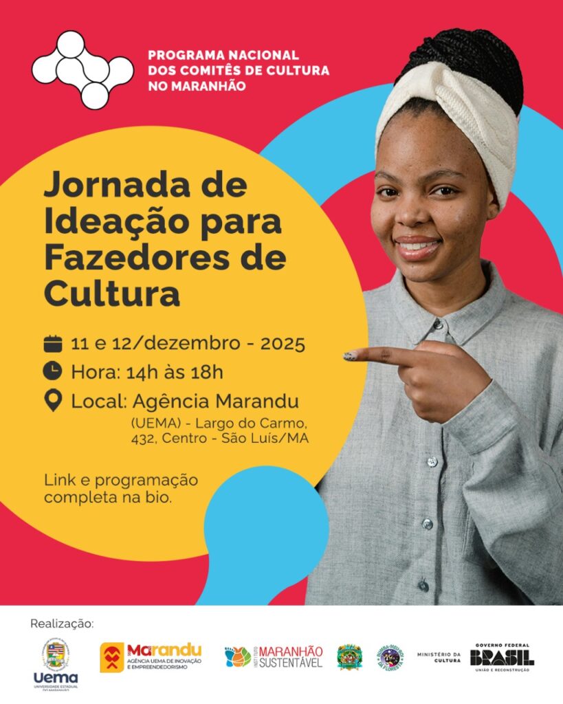 A Universidade Estadual do Maranhão (Uema), por meio da Agência de Inovação e Empreendedorismo (Marandu), e em parceria com o Comitê de Cultura do Maranhão, realizará a “Jornada de Ideação para Fazedores de Cultura”. Evento que tem como objetivo conectar estudantes, professores e agentes culturais para cocriar soluções inovadoras voltadas aos desafios enfrentados pelos protagonistas da cultura popular no estado.