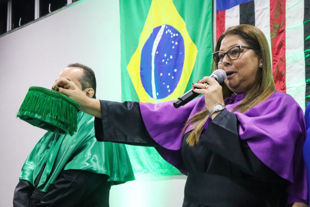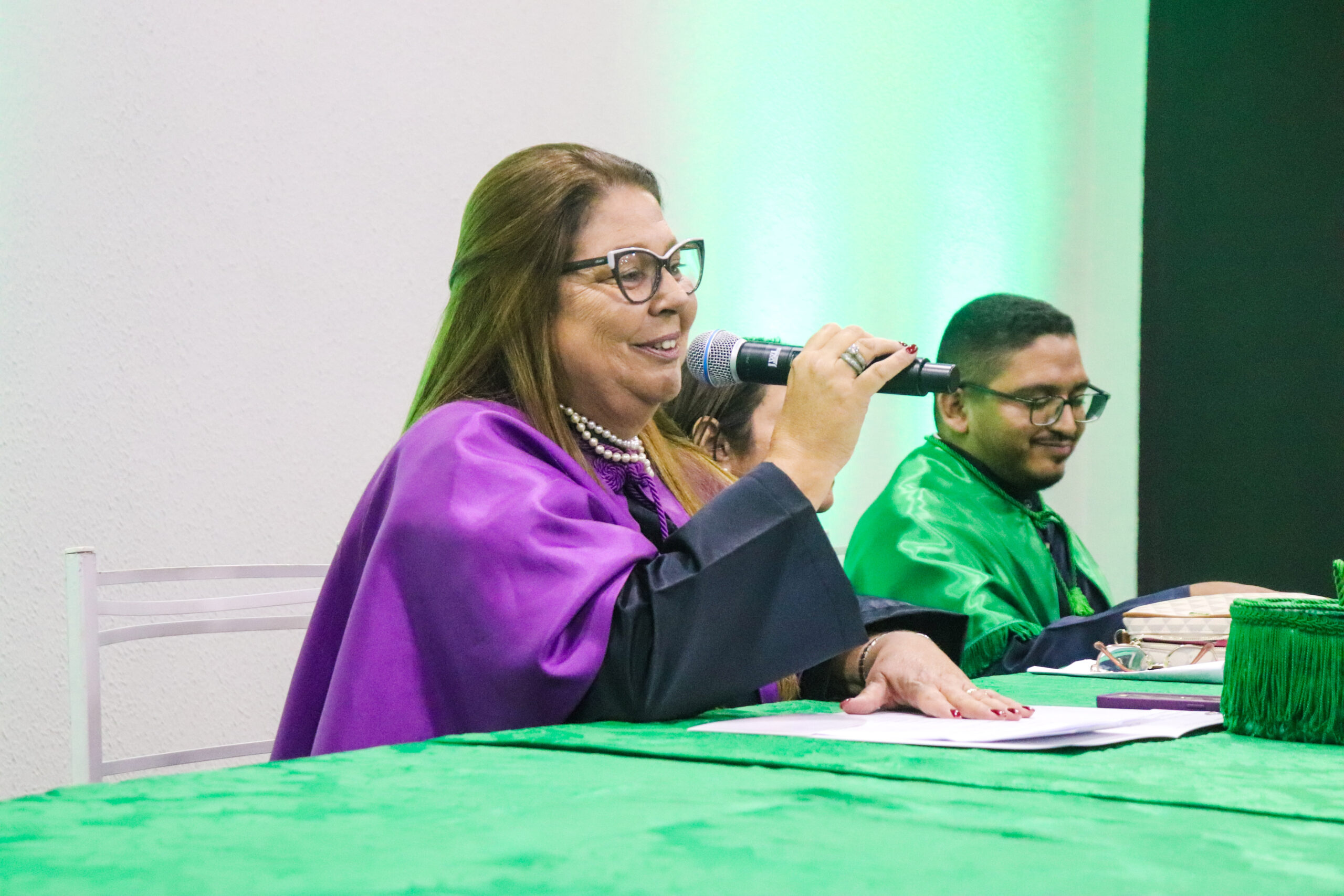 Representando o reitor da Uema, professor Walter Canales, a pró-reitora de Graduação, professora Monica Piccolo, destacou em seu discurso a importância da trajetória acadêmica dos concluintes e os desafios superados ao longo da formação.