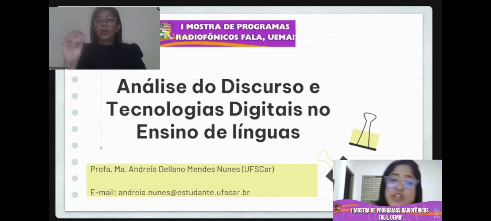 A Mostra contou com a presença da Profa. Ma. Andréia Dellano (UFSCar) com a conferência de abertura “Análise do Discurso e Tecnologias Digitais no ensino de línguas” e do radialista e jornalista Nilson Ferreira com a palestra de encerramento “Discurso e Comunicação”. Também a Profa. Esp. Eliene Guimarães como intérprete de LIBRAS durante as palestras.