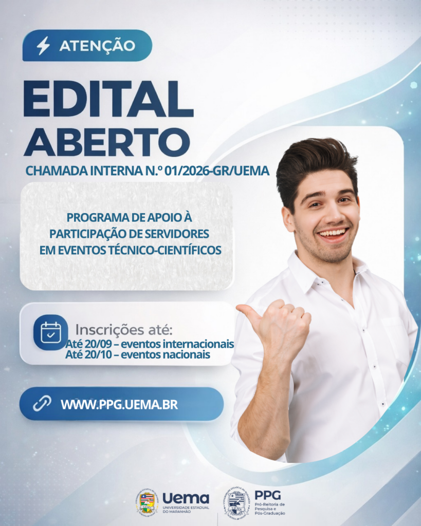 A Universidade Estadual do Maranhão, por meio da Pró-reitoria de Pesquisa e Pós-graduação, publicou a Chamada Interna nº 01/2026-GR/UEMA, que institui o Programa de Apoio à Participação de Servidores em Eventos Técnico-Científicos. A iniciativa prevê a concessão de diárias e/ou passagens para docentes que tenham trabalhos aprovados para apresentação em congressos e eventos similares, no Brasil e no exterior.