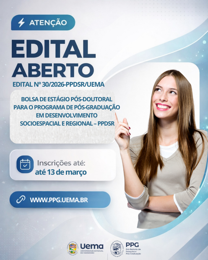 A Universidade Estadual do Maranhão lançou o Edital nº 30/2026 para seleção de bolsistas de estágio pós-doutoral para o Programa de Pós-Graduação em Desenvolvimento Socioespacial e Regional (PPDSR). A iniciativa integra o Programa de Redução de Assimetrias na Pós-Graduação e visa fortalecer a produção científica na área de Planejamento Urbano e Regional/Demografia.