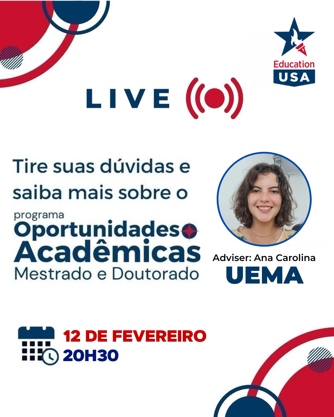 A Universidade Estadual do Maranhão (Uema), por meio da Superintendência de Relações Internacionais (SRI), realizará, na próxima quinta-feira, dia 12, às 20h, uma live informativa sobre o Programa Oportunidades Acadêmicas – Mestrado e Doutorado, iniciativa vinculada à rede EducationUSA, que oferece apoio completo a estudantes brasileiros interessados em cursar pós-graduação em universidades norte-americanas.