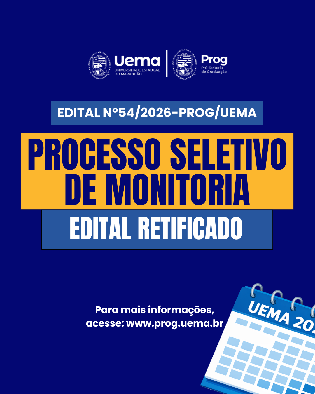 Confira o edital de retificação aqui: https://www.uema.br/wp-content/uploads/2026/01/EDITAL-N.o-54-2026-PROGUEMA.pdf