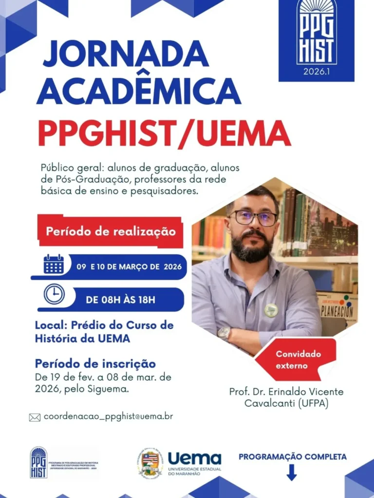A Universidade Estadual do Maranhão (Uema), por meio do Programa de Pós-Graduação em História (PPGHIST), realizará a Jornada Acadêmica nos dias 09 e 10 de março, das 08h às 18h, no prédio do Curso de História, em São Luís, para marcar o início do semestre 2026.1 e integrar a comunidade acadêmica.