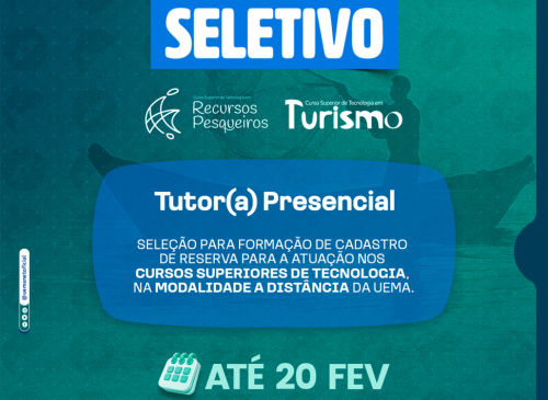 O Núcleo de Tecnologias para Educação (Uemanet) abre inscrições para a formação de cadastro de reserva de tutores presenciais que atuarão em cursos superiores de tecnologia na modalidade a distância. A seleção é voltada para os cursos de Graduação em Tecnologia em Recursos Pesqueiros e Tecnologia em Turismo.