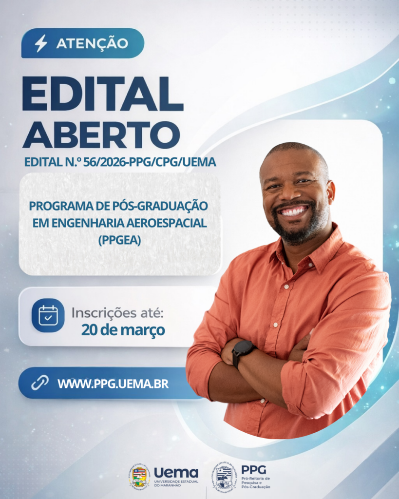 A Universidade Estadual do Maranhão (Uema), por meio da Pró-Reitoria de Pesquisa e Pós-Graduação, publicou o edital de seleção para o Curso de Mestrado do Programa de Pós-Graduação em Engenharia Aeroespacial (PPGEA). As inscrições estarão abertas no período de 13 a 20 de março de 2026, realizadas exclusivamente de forma on-line.