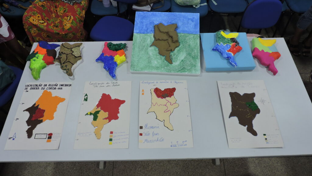 Como atividade prática, os estudantes produziram mapas representando as regiões geográficas intermediárias e imediatas do estado do Maranhão. Divididos em grupos, eles confeccionaram os materiais utilizando diferentes recursos, como EVA, papel crepom e isopor, que permitiram criar relevo e destacar visualmente os elementos representados.