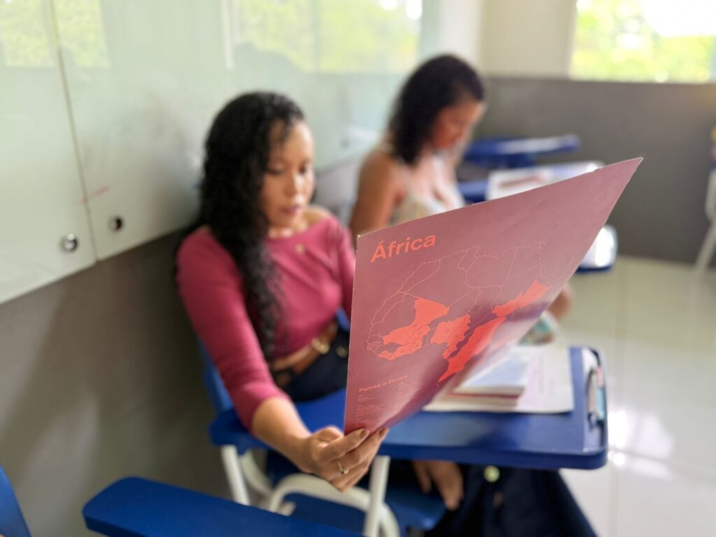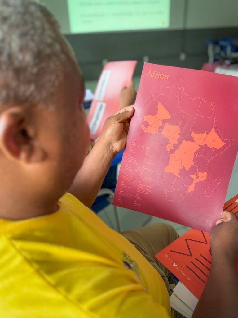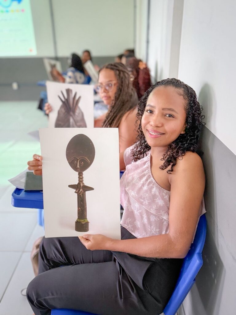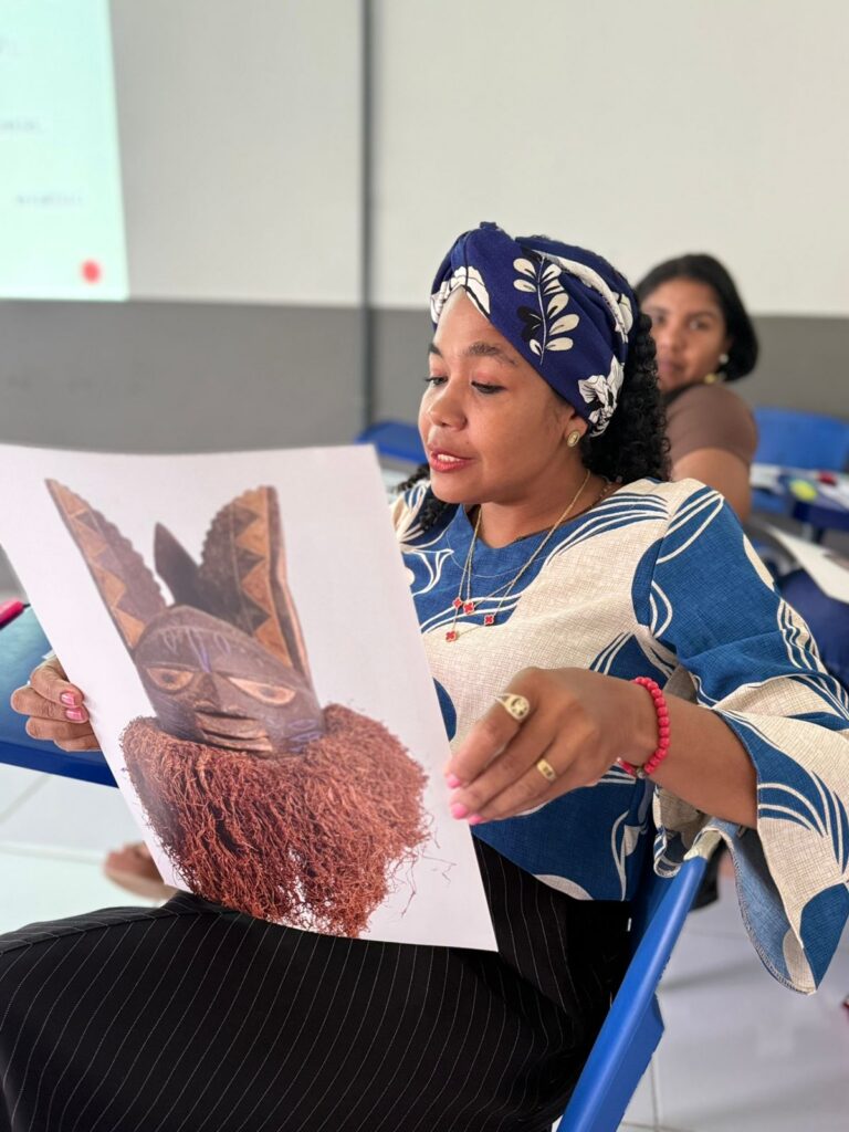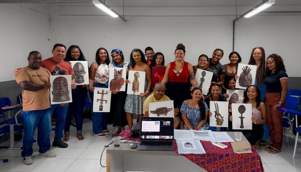 Durante a aula, cada estudante ficou responsável por analisar a arte de um país africano, a partir de máscaras, estatuetas e diferentes objetos artísticos apresentados no material da exposição. A atividade permitiu que os cursistas refletissem sobre as múltiplas dimensões da arte africana e afro-brasileira, compreendendo essas produções não apenas como formas estéticas, mas como expressões profundamente ligadas à ancestralidade, à espiritualidade e à organização comunitária.