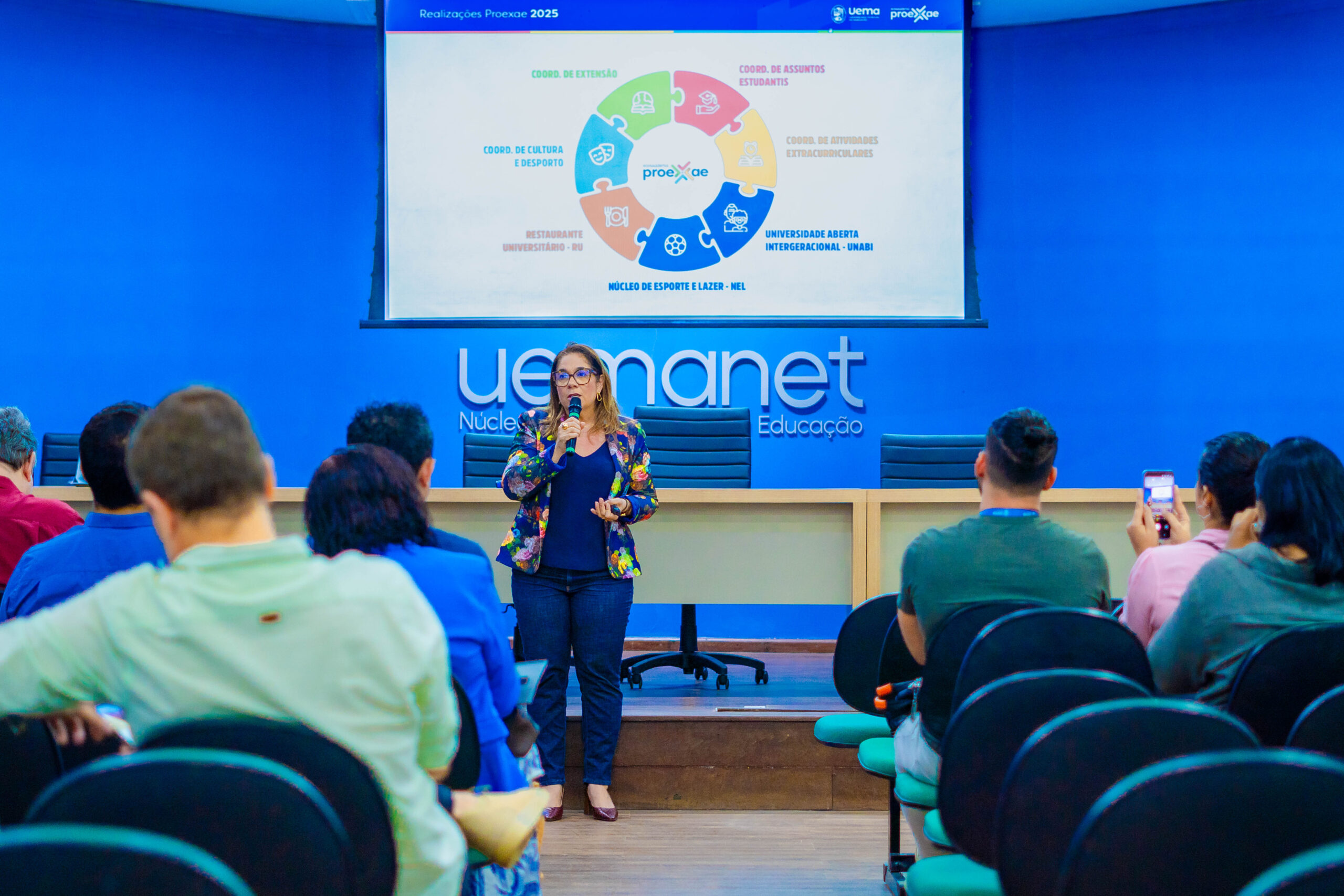 A atividade ocorreu no auditório do Núcleo de Tecnologias para Educação (Uemanet) e foi transmitida para os demais campi, contando com a presença do reitor Walter Canales; da pró-reitora da Proexae, Ilka Serra; do pró-reitor da PPG, Marcelo Cheche; da pró-reitora da Proinfra, Teresinha Coelho; bem como de chefes de departamento e coordenadores.