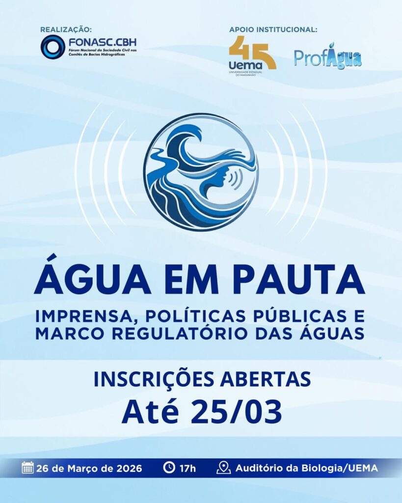 A Universidade Estadual do Maranhão (Uema), por meio do Programa de Mestrado Profissional em Rede Nacional em Gestão e Regulação de Recursos Hídricos (ProfÁgua/Uema), em parceria com o Fórum Nacional da Sociedade Civil nos Comitês de Bacias Hidrográficas (Fonasc.CBH), promoverá o seminário “Água em Pauta: Imprensa, políticas públicas e marco regulatório da água”.